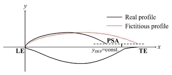 Due to the consideration that the height of the specified planar segment on the upper surface remains constant, the LE-PSA profile can be simply enlarged to the local chord length along the x axis by multiplying the x coordinates by a factor c/xPSA, as shown in Figure 5, and then the fictitious airfoil profile can be generated and controlled using conventional parametric methods.