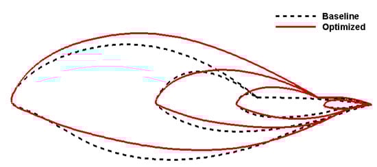 Figure 10 shows comparison of the sectional airfoil profiles. It can be found that the forward cambers of the optimized sectional airfoils are remarkably increased when compared to the baseline sectional airfoils. The locations of the maximum thickness of all these sectional airfoils are shifted backward, and the planar region significantly moves backward as well.