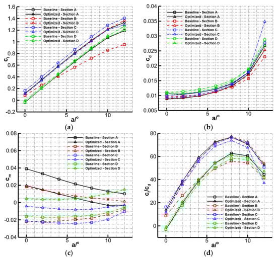 Comparison of the sectional airfoil performance between before and after the optimization. (a) Lift performance. (b) Drag performance. (c) Pitching performance. (d) Lift-to-drag performance.