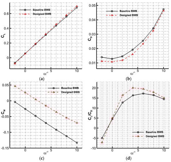 Comparison of aerodynamic performance of the BWB configuration. (a) Lift performance. (b) Drag performance. (c) Pitching performance. (d) Lift-to-drag performance.