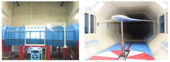 The wind tunnel experiments were carried out in the FL-8 3.5 m × 2.5 m low speed closed circuit wind tunnel of the Aviation Industry Corporation of China (AVIC) Aerodynamics Research Institute (ARI) in Harbin (see Figure 14). The FL-8 wind tunnel is equipped with an octagonal form test section, and the flow-field quality within the test section is able to reach up to 0.0001 drag measurement accuracy. For this test, atmospheric conditions were measured at wind tunnel location (ρ = 1.20978 kg/m3, μ = 1.7853 × 10−5 Pa s, T = 14.8 ℃ and p = 99 kPa). Stainless steel was used to manufacture the scale model [24] of the designed BWB configuration in portion with 1: 1.8, and the test velocity was fixed at 68 m/s, which corresponds to a Reynolds number equal to 2.0 × 106.