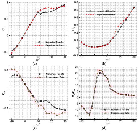 Comparison of aerodynamic performance between the numerical results and the experimental data. (a) Lift performance. (b) Drag performance. (c) Pitching performance. (d) Lift-to-drag performance.