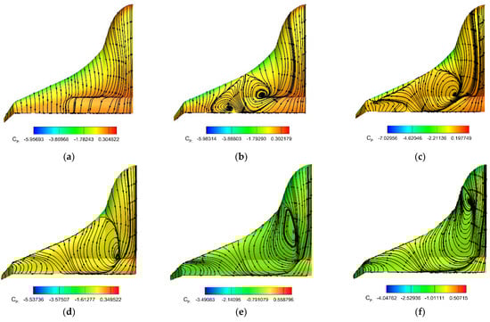 Numerical surface flow distribution development with angle of attack. (a) α = 8°. (b) α = 12°. (c) α = 16°. (d) α = 20°. (e) α = 24°. (f) α = 28°.