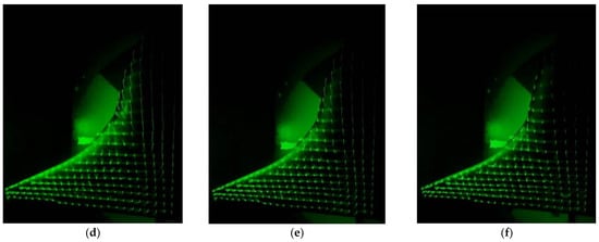Experimental surface flow distribution development with angle of attack. (a) α = 8°. (b) α = 12°. (c) α = 16°. (d) α = 20°. (e) α = 24°. (f) α = 28°.
