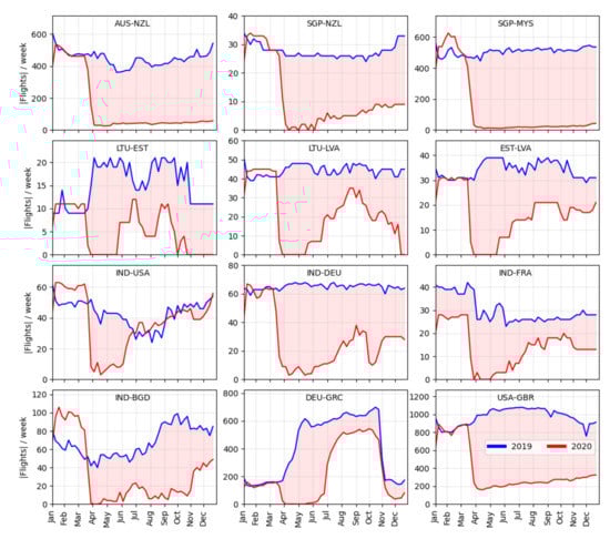 The number of flights per week between selected countries pairs, comparing data for 2019 (blue) and 2020 (red).