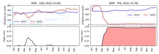 Comparison of flight ratio discrepancy for two selected countries pairs: Korea–United States (left) and Korea–Philippines (right).