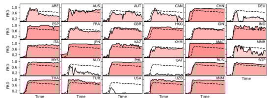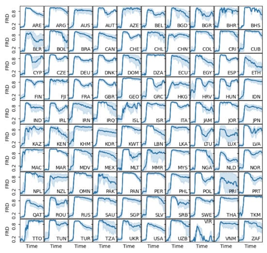 We continue exploring the temporal evolution of area under the curve of FRD values for the top 100 countries in this study, as presented in Figure 5. There are only few countries with average area under the FRD smaller than 0.5, namely: Ethiopia (ETH), the Netherlands (NLD), Puerto Rico (PRI), Qatar (QAT), and the Virgin Islands (VIR). It seems as though countries in Asia have preferably executed stronger flight bans.