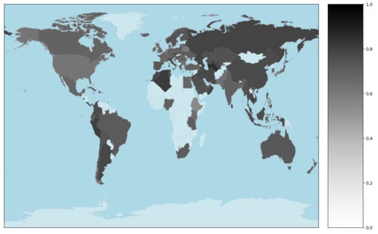 and the area under the FRD as , where I is the set of all intervals. In this study, the intervals are Week 1 to Week 52 in the years 2019 and 2020. The intuition of Equation (1) is as follows: A high value of suggests a strong reduction in the number of flights. The value is cut off at 1.0, in order to avoid introducing compensation effects, where the number of flights in 2020 is (temporarily) larger than in 2019. Finally, the area under the FRD over all I is a representation of how intense the travel bans between two countries were; with larger values indicating stronger travel bans.