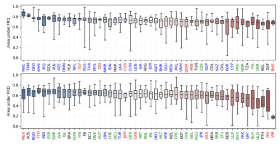 Figure 7 presents a different view on the previous experiment, ranking all countries according to the standard deviation of area under the FRD, with increasing values. It can be observed that those countries with a smaller standard deviation are often those countries which performed a stricter flight ban (as indicated by the larger median values), with the exception of the Virgin Islands (VIR). Moreover, it is notable that, contrary to Figure 6, there is no obvious pattern regarding the continents.