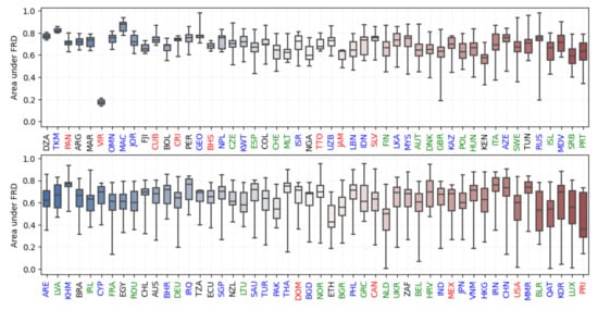 In order to further explore this effect, Figure 6 shows the distribution of the area under the FRD for each country in this study. The countries are sorted by their median area under the FRD. Countries from selected continents are highlighted: Asia (blue), Europe (green), and North America (red). It can be seen that Asian countries are preferably located on the left-hand side of the chart, indicating a more proficient flight ban. European countries are more relaxed regarding flight bans, being found towards the center of the x-axis. Towards the right-hand side, a few countries can be found that kept their flights significantly more open, e.g., the Netherlands (NLD), Qatar (QAT) and Ethiopia (ETH). Nevertheless, the wide range of values for individual countries suggests destination-specific choices when making flight bans.
