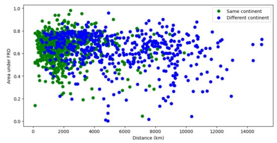 In Figure 8, we address the question of whether the flight bans were preferably executed on long-distance connections by plotting the distance between airport pairs (x-axis) against the area under the FRD (y-axis). Surprisingly, there is no obvious correlation between these two variables, suggesting that the distance alone is not a good explanatory variable for the execution of long-term flight bans. By highlighting continental information using colors, we can see that the fact that whether two countries belong to the same continent has negligible contribution to the area under the FRD either. Accordingly, these decisions are more likely to be explained by individual measures and connections concerning economics and other alliances.