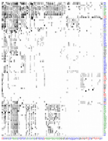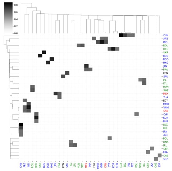 Figure 9 reports the area under the FRD curve for each country pair in this study. A darker cell indicates a smaller AUC, which in turn indicates a smaller reduction in the number of flights in 2020 with the year 2019 as a baseline. The countries are clustered hierarchically based on their aggregated similarity; as indicated by the tree structures along the left and top axis. Countries from selected continents are highlighted: Asia (blue), Europe (green), and North America (red). It can be observed that there are four large clusters, listed from the bottom-right to the top-left. The first cluster consists mainly of countries in Asia and Oceania. Half of these countries are well-connected to Europe/North America, e.g., including Japan (JPN), South Korea (KOR), and Singapore (SGP). Notably, China (CHN), Thailand (THA), and India (IND) are not part of this cluster. In addition, all countries are well-connected to the critical hub countries Qatar (QAT) and the United Arab Emirates (ARE).