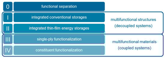 Structural batteries or multifunctional electrochemical energy storage systems combine energy storage capabilities, like conventional lithium-ion (Li-ion) batteries, with the mechanical properties of composite materials like carbon-fiber-reinforced polymers (CFRPs). They can be classified into different categories depending on their degree of structural integration. This review adopts a convenient 5-class system, introduced in [7] and shown in Figure 1, starting from a side-by-side combination of a structural element and a conventional battery (zero degrees of integration) and increasing the degree of integration from integrating battery cells into structural components (type I), thin-film approaches (type II), up to a fully integrated system, for which the structural element (type III) or material (type IV) also functions as an energy storage unit.
