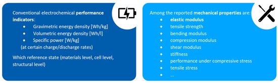 The evaluation of the electrochemical performance of structural batteries usually uses straightforward parameters as performance indicators, such as specific energy or gravimetric energy density (in Wh/kg), volumetric energy density (in Wh/L), or specific power (in W/kg). In some cases, the exact material for which data are reported is not explicitly stated (all, only active, etc.), making comparative analyses of data difficult. However, reasonable assumptions can usually be made from the complementary data provided. On the other hand, the evaluation of the mechanical capabilities of structural batteries takes more effort because applied testing methods are usually closely related to the envisioned application. As such, a large variety of different mechanical properties are reported, among them: elastic modulus [11,12,13,14,15,16], tensile strength [11,14], bending modulus [16], stiffness [17,18], performance under compressive stress [19], tensile stress [20], compression modulus [21], and shear modulus [22]. This considerably complicates any comparison between different studies. However, the elastic modulus is recently becoming an accepted representative of the overall structural performance of the structural battery [11,23]. For aeronautic applications, additional mechanical properties should be considered, e.g., the onset of damage or the strengths for different loadings, such as bending or compression. Common performance indicators for the evaluation of structural batteries are compiled in Figure 2.