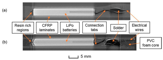 Examples of integrated conventional storage: cross-sectional X-ray CT images of an embedded LiPo pouch cell in (a) CFRP laminate and (b) sandwich composite [38].
