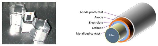 The coaxial approach envisions a fiber-shaped battery, which is composed of a carbon-fiber core onto which an electrolyte layer is deposited; afterward, the fibers are immersed into a matrix acting as the cathode material [63,64,65].