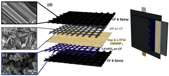 For type-IV structural batteries, as depicted in Figure 6, different setups were proposed; these can be classified into coaxial [63,64,65] and layered approaches [22,66,67].
