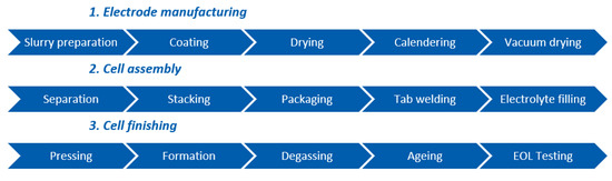 For conventional pouch cells, the process chain of the current manufacturing process, as shown in Figure 7, is generally divided into three sections: electrode manufacturing, cell assembly and finishing.