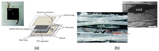 It is important to note that, typically, a low level of pressure has been applied (about 1 bar) during the curing cycle. However, curing composite parts at low pressure may result in the formation of voids, as reported in Figure 10b, that generate transverse cracks or delamination, decreasing the rigidity and strength of the composite part. This is clearly an issue for aeronautical applications.