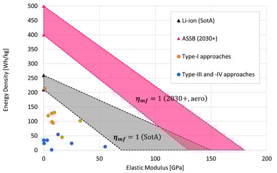 Performance evaluations and possible shortcomings of type-IV cells have been studied with analytical and numerical models: an inverse relationship between the shear modulus and the achievable energy density has been predicted [22]. Energy densities of around 146 Wh/kg @ C/10 are expected, assuming NMC622 and CF as active materials and a separator thickness of 25 µm, but reducing the elastic properties of the composite by approx. 50% in a longitudinal direction and by 80–90% in a transverse direction [63,64].