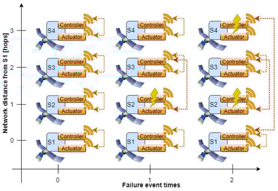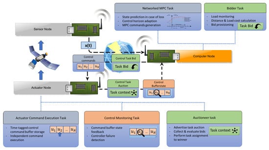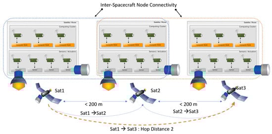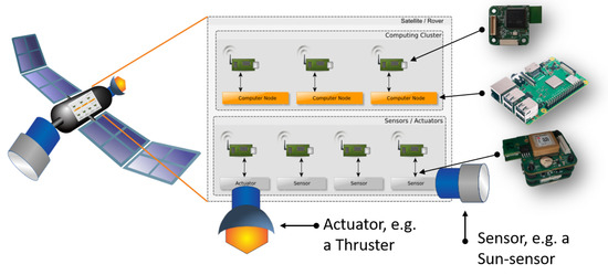 Going beyond inter-satellite cooperation, projecting this trend into the future leads to a combination of inter- and intra-satellite cooperation. Here, taking further modularization and standardization of satellites subsystems into account, the components of a single- and multiple satellite system are generalized as independent wirelessly connected interacting functional nodes who are jointly working towards a common goal. By classifying the physical satellite platform components as either actuator-, sensor- or computing node according to their main role in the satellite system, the physical border between satellites becomes blurred and a bigger system of cooperatively interacting nodes emerges. Allowing both intra- and inter-satellite cooperation of functional satellite elements deepens the already existing advantages of today’s multi-satellite structures while further extending them with an increased extend-ability, re-usability and robustness of the overall system [4,5,6,7,8,9]. An illustrative example of such a spacecraft equipped with an optical instrument as sensor and a thruster as actuator is sketched in Figure 1 and is used as reference architecture in the rest of the work.