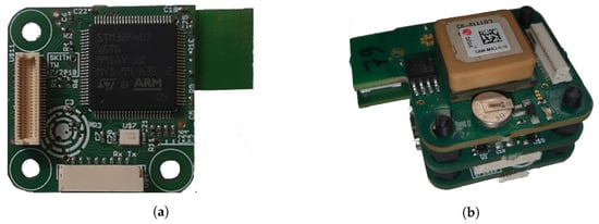 (a) The sensor/actuator HW base board with a STM32F4 microcontroller and a DWM1000 ultra-wideband transceiver. (b) Base board with daughter board extensions to form a GPS sensor node unit.