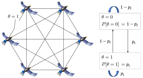 For all packets are lost during . The probability for a lost packet between two nodes is denoted with and a successful transfer has a probability of . The loss probability is assumed to be independent of the current network state and the transition from one network state to another is equal to and respectively. This is visualized in Figure 3.