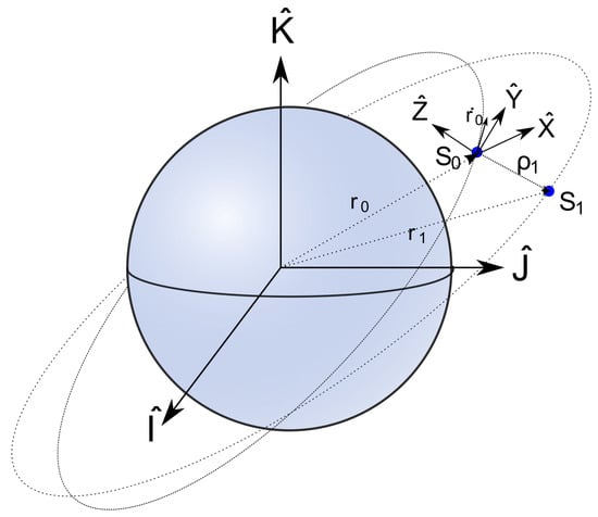 The motion of each individual satellite can be described in an Earth-Centered Inertial (ECI) frame by the position vector from the center of the Earth to the position of the satellite along its orbit and the velocity vector . The motion of a single satellite in Earth’s gravitational potential with respect to the ECI reference frame can be described as follows [38]: