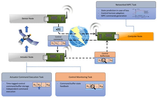Despite the aforementioned advantages of such distributed spacecraft architectures, there are also several new challenges that these missions face. Especially the coordination and control of such a system of systems over a possibly unreliable and imperfect communication network poses a major task. It is therefore of utmost importance to have suitable control approaches for attitude and formation control, two of the most common control tasks in most missions, that are able to deal with the intra- and inter-satellite node network characteristics. The influencing characteristics of the node network on the control performance are mainly the delay and possible loss of information exchanged in the control loop. These effects can occur in the distributed control-loop on the network connection between sensor-node and controller-node and between controller-node and actuator-node. There already exist several control approaches which take one or more of these delay/loss scenarios into account. Specifically for wireless control networks there are recent developments to employ event-driven control to such systems to compensate for network effects and limit the required communication amount [28,29,30], some of them are already tailored for formation and attitude control of spacecraft [31,32,33]. A distributed robust control approach where one controller node aboard one modular satellite controls the actuators of two satellites under the presence of intermittent sensor data losses was investigated in [34]. A further increase in control constraint capabilities while allowing information losses on the controller to actuator communication link in addition to sensor data losses was presented for model predictive attitude control in [25]. The development of optimal predictive formation control subject to sensor- and controller-data losses and delays was realized in [27].