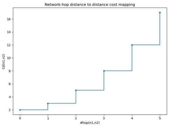 With the scaling factor , becomes , which penalizes hop-counts in a non-linear fashion. The cost function is depicted in Figure 7. We opted for a non-linear penalization of hops, in order to account for the increasing network load induced by communication over a larger number of hops. The value is a bias value that weighs the hop-distance criterion with regard to the other criteria used in the fused scalar sum discussed later.