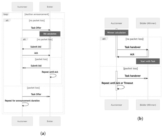 To satisfy design criteria DC1-3, e.g., low computational complexity on the allocating node, good scalability with the number of computing nodes and a deterministic allocation time almost independent of the node number, we decided to choose an auction-based sequential single task allocation approach [50,51,52,53,54]. In the auction-based sequential single task allocation the initiator or auctioneer, in our case the actuator node, offers a single task to prospective bidders. It does this by sending a task-auction initiation message containing the task context via broadcast to all reachable bidders, i.e., computing nodes. The bidders then locally calculate their suitability for the task expressed as a single scalar value or vector of scalar values. For the computation, they only use the provided task context and local available information. Subsequently, they send the calculated values back as bid to the auctioneer. The auctioneer then selects the winning bid using a simple selection strategy, e.g., selecting the lowest value and announces the corresponding winner thereby ending the auction process. Design criterion DC4 to have low network load is also satisfied, because in the best case, e.g., no network loss, the bidders communicate only once placing their bids, while the auctioneer communicates twice, once to announce the auction and once to announce the winner. Mitigation procedures for communication losses are discussed later, which require a few more communication events, but the overall burden on the network is still very limited. Finally, design criterion DC5, the possibility for multiple objectives driving the allocation choice is also realized by encoding each objective as appropriately scaled scalar value and fusing all of them together, e.g., with a weighted sum, to a single bid value.