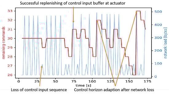 By choosing a faster adaption of N to increasing data loss on the network than to decreasing data loss events is realized, therefore following a more conservative adaption strategy. The threshold constant is used to account for additional network uncertainty and increases the number of time steps until reaches the command reserve. This command reserve is chosen, so that in case of controller failure enough command reserve exists to facilitate a redistribution of the control task before the command buffer at the actuator runs out. The first control horizon length is set to with calculated according to Equation (6) using the expected network loss probability and the desired probability for at least one successful transfer from the controller before reaches the command reserve. Results of this adaption rule are shown in Section 3.2.