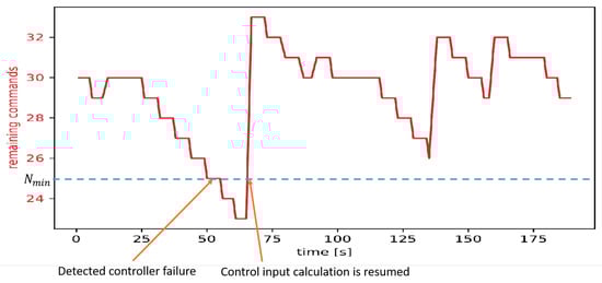 Now a similar scenario to the previous one is considered. Satellite 3 starts now at position and should be driven again to . During the control process the controller node belonging to satellite 3 fails at s leading to a continuing depletion of the control input buffer at the actuator of satellite 3 which is shown in Figure 17. Once the remaining stored commands fall below , the controller failure is detected by the actuator and a control task re-assignment is initiated by the actuator node via the described auction procedure at s.