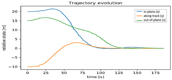 To implement the MPC formulation given in Equation (5) on a digital controller, the problem needs to be reformulated as a discrete time problem with sample time . In addition, the system dynamics are realized as discrete state space model of the relative satellite motion described in Equation (4) by assuming a sample-and-hold application of the control input to the system for the duration of the sample time . In addition we assume the prediction horizon length N and control horizon length for time step j to be equal which does not impact stability as the Lyapunov stability constraint is independent of control and prediction horizon length [45]. This leads to the following discrete time MPC formulation with solution :