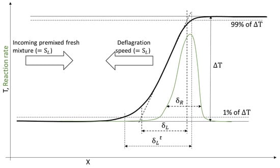 Generic stationary laminar flame front, including different definitions of flame thickness. Here, “reaction rate” is defined as the sum of the absolute values of the time derivatives of all of the present species’ molar fractions ().