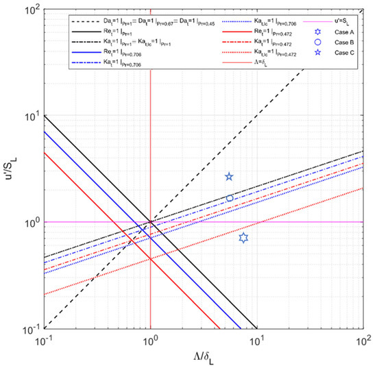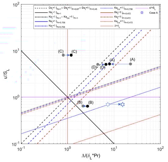 Other added fractions are for the derivation of Equations (35)–(38). As an example, the diagram corresponding to Equations (39)–(42) is shown Figure 9. Also here, the indicated letters correspond to particular literature according to: (A)[19]; (B)[33]; (C)[43]; (D)[35]. As the underlying formulae indicate, the size of the shift in the isolines is independent from their iso-values. However, the shift is very different, depending on the modification of the x-axis. The shown version stands out, as here, the shift in the isoline is minor, and the isoline is stable. This enables comparisons in terms of both criteria. The -dependent shift in the isoline for on the other side is much stronger than in the original regime diagram in Figure 2. To counteract this, the corrections in Equations (35)–(38) can be applied instead. The discussed corrections can be applied graphically or mathematically. In any case, they allow the right association of the flame characteristic parameters ( with the dimensionless numbers (.