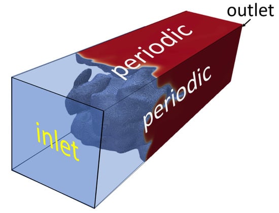The simulation tool that was used was the EBI-DNS [23] solver within the OpenFoam [24,25] environment. The governing equations in this solver were determined according to compressible Navier–Stokes formulation [15]. The conservation of mass and momentum are solved as in Equations (17) and (18), respectively.