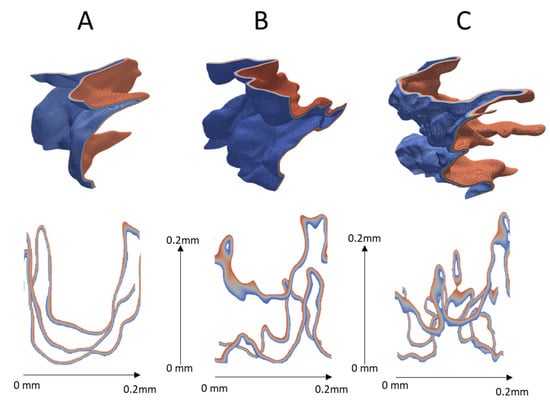 Three-dimensional depictions and two-dimensional slices (three each) of flame fronts from three DNS-simulated premixed combustion cases (A–C). The slices show the inner patterns. The colour range for filtering the flame fronts is from 1000 K (blue) to 3000 K (red).