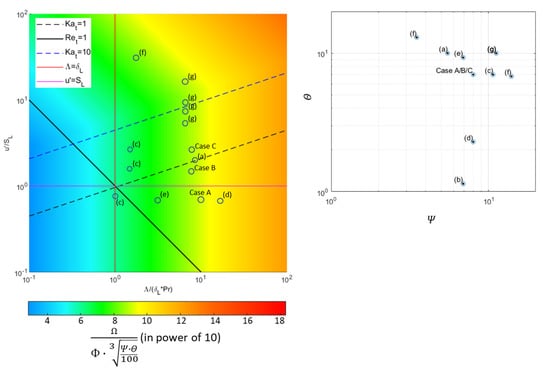 These are the functions behind the isolines in Figure 2. There are various ways to divide the diagram into distinctive regime regions [16,17,20]. These elaborated thresholds are mainly based on the isolines for , , , and . However, in this work, the general treatment of these isolines is discussed. Therefore, the presented version of the regime diagram is reduced to the three essential unity lines of the dimensionless numbers. Any -dependent shift in these unity lines can be easily reproduced for any other value. This way, a shift in any possible regime threshold can be accounted for.