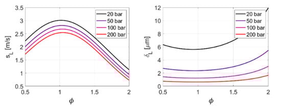 A juxtaposition of Equations (9) and (12) shows that there are two ways of defining and hence . One way is to use the integral characteristics of the flame front, and the other is to take the values of the local gas. These methods of calculation can result in very different values, as discussed in the following section. This issue is often avoided by equalising with and therefore assuming to be 1 [18,19]. This assumption does not hold for most gases. For example, the characteristic Prandtl number within a CH4-O2 flame under 20 bar is 0.706, where before the reaction, and after the reaction. In case the of a H2-O2 flame, .