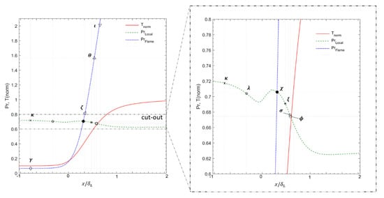 Subsequent points repeat previous techniques; however, they repeat in terms of the local formulation of from Equation (12). Point represents the most common simplification, where the of the reactants is used [33,42]. In , , and , the local values throughout the flame are calculated as the average, Favre-average, and the middle value, respectively. An alternative option states point , which is at a particular position where the temperature reaches the autoignition temperature. All of the points from to provide similar and reasonable values, with a deviation of 6.3%. However, they are positioned far from each other. Hence, if any other quantity, such as the viscosity value, was to be retrieved from them, the values would strongly vary.