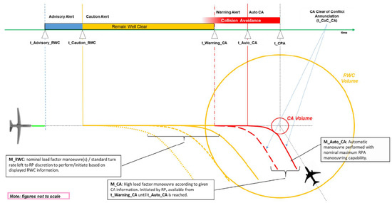 TCAS-II is mandatory within European Union airspace for aircraft with a maximum take-off weight exceeding 5700 kg or authorized to carry over 19 passengers [19]. This means that in the airspace classes from D to G, characterized by the presence of small- and medium-sized aircraft, there can be aircraft not equipped by a transponder and/or TCAS, since only larger commercial aircraft are TCAS-II equipped. Therefore, in these airspaces most aircraft have neither surveillance nor collision avoidance assistance, leaving it to the see-and-avoid capabilities of the pilot, the compliance with the rules of the air (ICAO Annex II [4]), and the responsibility to avoid operating in the near proximity of other traffic that may create a collision hazard. In this context, the RWC function replaces the TCAS-II TAs and the pilot see-and-avoid capability for remotely piloted unmanned vehicles in separation management operations trying to avoid the perforation of a specific safety volume around the aircraft called the Well Clear volume (WCV).