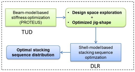 The aeroelastic tailoring approach applied in this work is a multi-fidelity approach, originally developed in the European Smart Fixed Wing Aircraft project and described in [27]. The process addresses the fact that the design space for the design of aeroelastically tailored wings is usually very large, due to the large number of design variables and constraints that are typically associated with this type of problem. A two-step approach is thus followed to systematically converge on an optimized structural design. In FLEXOP, a modified version of the process using a sequential approach of using beam and shell models for the wings is implemented, as shown in Figure 2.