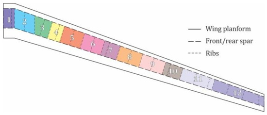 The objective of the design optimization is to minimize the structural mass of the wing. For a sufficiently large design space, the wing is split into 12 spanwise design regions, as shown in Figure 4. Considering ease of manufacturability, only one chord-wise design region is applied. Each design region corresponds to an area of the wing having the same laminate, or effectively the same stiffness. The stacking sequences in the upper and lower skins and front and rear spars are optimized for, while the laminates in the ribs are pre-defined. Additionally, the leading edge, trailing edge and flaps are not a part of the optimization exercise.