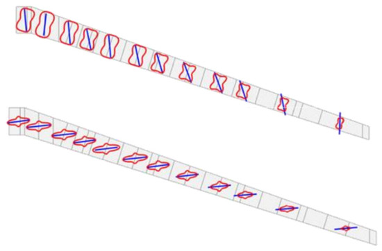 The comparatively better performance of the tailored wing is a direct result of the enlarged design space offered by unbalanced laminates. This larger design space is visualized in Figure 5, which shows the polar distribution of the A11 term of the in-plane stiffness matrix in the upper skins of the reference and tailored wings. The highly anisotropic stiffness distribution in the tailored wing results in the classic bend–twist composite coupling that produces a nose-down twist upon upward bending.