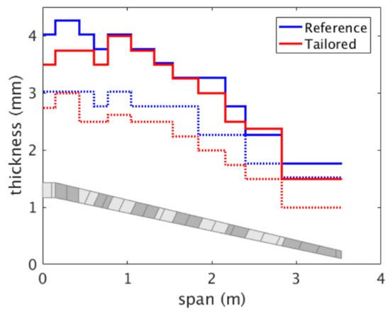 Consequently, a pull-up manoeuvre, for instance, produces a nose-down twist, which in turn results in an inboard-shifting of loads and, finally, in an alleviated root bending moment, as listed in Table 2. The reduced loads result in lesser thickness requirements, as shown in Figure 6, leading to the savings in structural weight. The thickness distribution shows two expected trends: (1) the tailored wing requires a lower thickness in the skins compared to the reference wing, on account of the reduced loads, (2) the thickness in the upper skin is larger than in the lower skin for both the tailored and reference wings, given the larger load factor for the sizing pull-up manoeuvre, i.e. +5 g against the push-down manoeuvre −2 g, causing the upper skin to experience larger compressive loads than the lower skin; thereby requiring larger thickness to meet buckling constraints, as well as strength constraints given the lower strength allowables in compression.