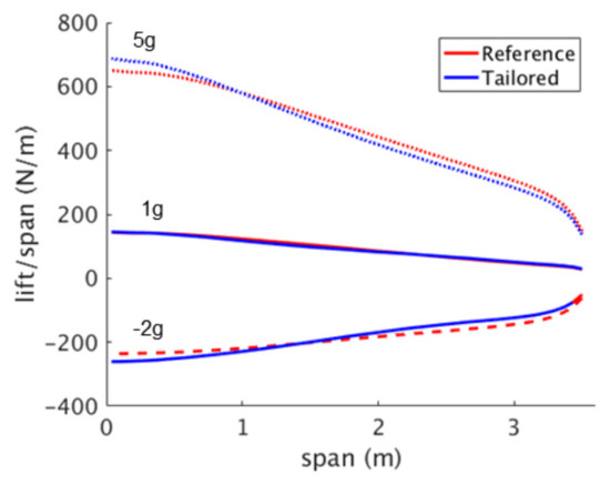 Span-wise lift distribution in the reference and tailored wings for different manoeuvre loads.