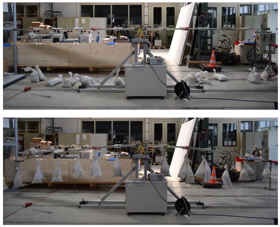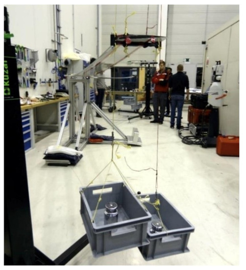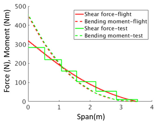 In addition to the static tests, an airworthiness test was performed on the wings in order to confirm that they can sustain the design limit loads, namely 5 g pull-up and −2 g push-down manoeuvres at the design conditions. A picture of the test-stand with the reference wing mounted is shown in its unloaded and loaded state in Figure 13. The wing was loaded with a 5 g and −2 g equivalent load by hanging sandbags at six span-wise locations on either side of the wings. In the case of the −2 g loads, the wing was flipped over before applying the loads. The equivalent loads were derived by matching the deflected shape of the reference wing with that of the FE model subjected to the limit loads. By applying the loads in this way, the resulting shear force and the bending moment along the span were recovered, as shown in Figure 14. One can observe that the equivalent shear force changes in discrete steps due to the fact that the forces are applied at discrete locations along the span of the wing. Nevertheless, the equivalent bending moment follows the bending moment in flight very faithfully.