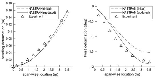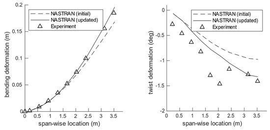 The bending and torsional displacement corresponding to the tested +2.5 g equivalent flight loads is shown in Figure 11 for the reference wing. A comparison between the initial NASTRAN FE model and the experimental results is also shown in the same figure. The initial FE model corresponds to the optimized design obtained in the second optimisation step as described earlier. It is seen that a maximum deviation of close to ~10% is observed in the tip displacement between the initial FE model and the physical structure. This difference can be attributed to a mix of reasons—modelling assumptions and simplifications, manufacturing deviations, material scatter, experimental accuracy, etc.