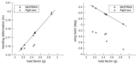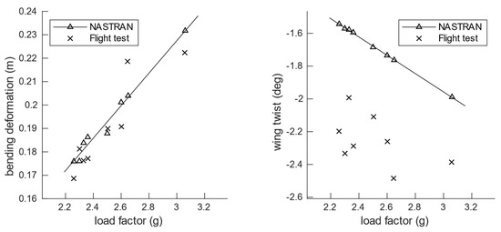 Flight loads are compared in terms of shear force and bending moment at the wing root. In the case of the reference wings, the difference between the flight test loads and aeroelastic simulations are ~14% and ~6% for the root shear force and bending moment, respectively, and similarly ~12% and ~9% in the case of the tailored wings. In the NASTRAN simulations, a perfect linear relationship is expected between the deformation or loads and the load factor. However, a small deviation in the simulated points is observed with respect to a fitted line. This is a result of different manoeuvres being performed at slightly different velocities, as shown in Table 4.